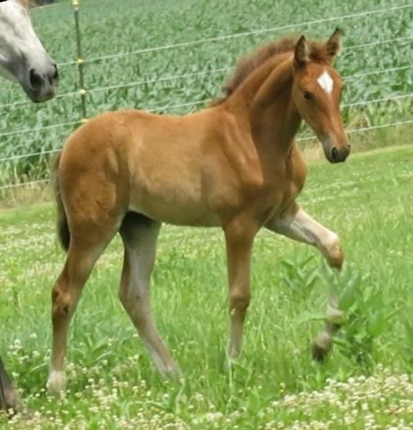 FLYNN YR, her 2024 buckskin stud colt by FELIZ DU CAREL is incredibly uphill and athletic. (SOLD)